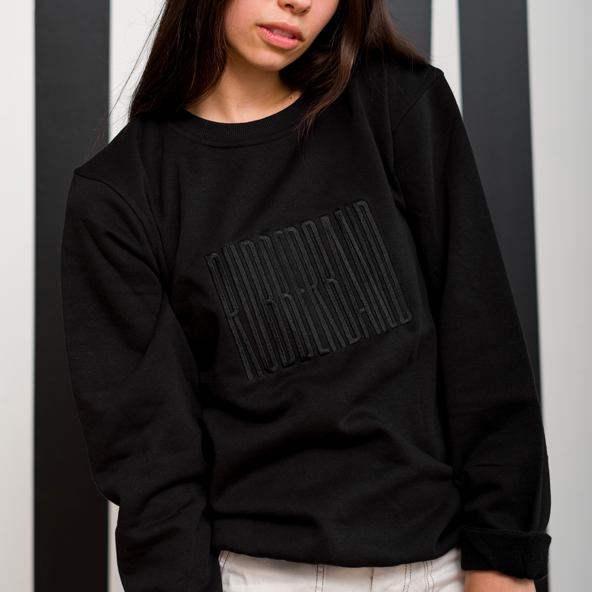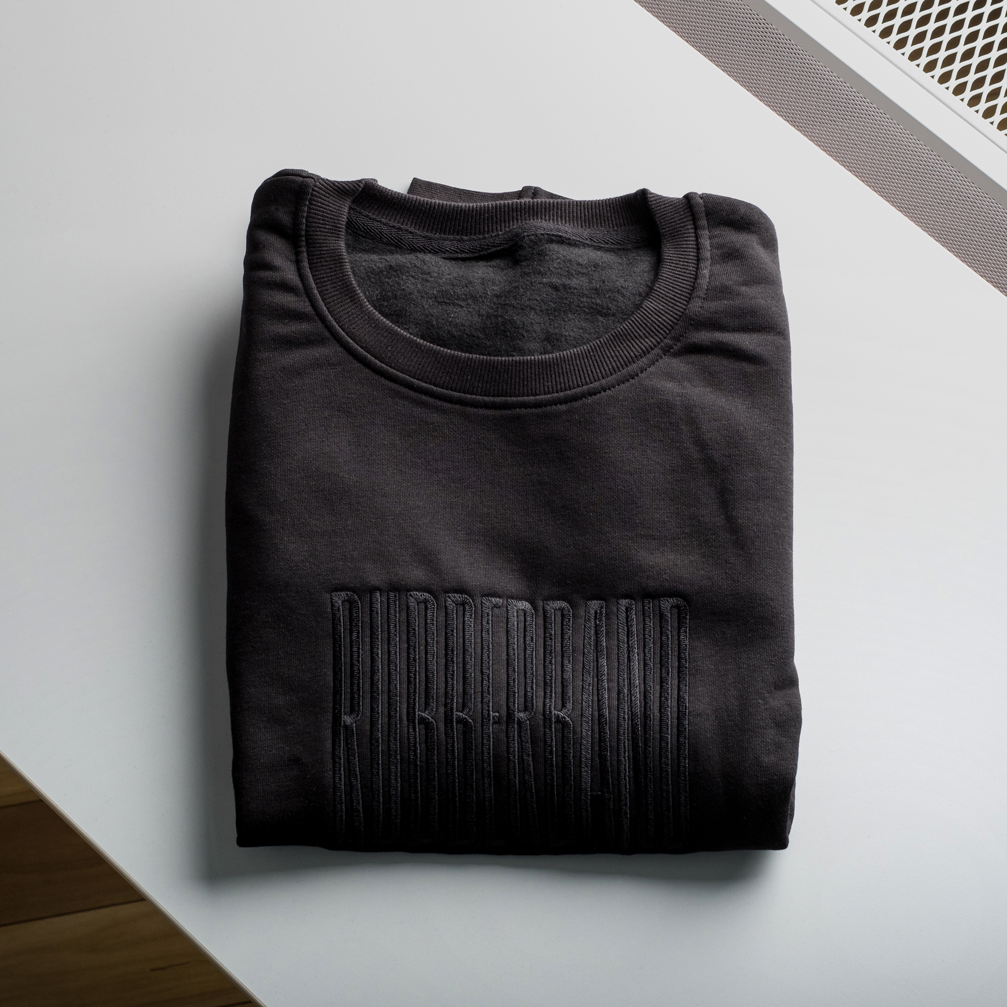 Camiseta negra de cuello redondo con logo de RUBBERBAND bordado en negro